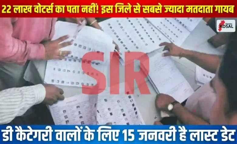 रायपुर: छत्तीसगढ़ में मतदाता सूची विशेष गहन पुनरीक्षण (SIR) की प्रक्रिया चल रही है। इस प्रारंभिक प्रक्रिया से जो आंकड़े सामने आए हैं, वे चिंताजनक हैं। प्रदेश में करीब 22 लाख मतदाताओं को डी कैटेगरी में डाला गया है, यानी इन वोटर्स की कोई पुख्ता जानकारी सामने नहीं आई है। इस बड़ी संख्या को लेकर कांग्रेस ने सवाल उठाए हैं और मतदाता सूची की शुद्धता पर बहस शुरू हो गई है। हालांकि, चुनाव आयोग के अनुसार, छत्तीसगढ़ में करीब 97 फीसदी एसआईआर का काम हो गया है।