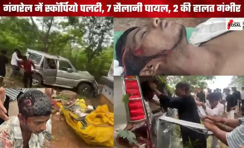 धमतरी। Gangrel Accident: खरोरा क्षेत्र के कोसरंगी गांव से गंगरेल घूमने आए पर्यटकों की स्कॉर्पियो वाहन रविवार को लौटते समय शीतला मंदिर के पास अनियंत्रित होकर पलट गई। हादसे में वाहन सवार 10 में से 7 लोग घायल हो गए, जिनमें 2 की हालत गंभीर बताई जा रही है।