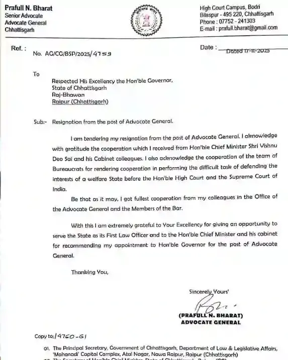 महाधिवक्ता प्रफुल्ल भारत ने राज्यपाल को सौंपे गए अपने त्यागपत्र में मुख्यमंत्री विष्णुदेव साय और उनके मंत्रिमंडल के सहयोगियों द्वारा दिए गए सहयोग के लिए आभार व्यक्त किया है। उन्होंने लिखा है कि वह महाधिवक्ता पद से अपना त्यागपत्र दे रहे हैं। उनका यह इस्तीफा राज्य में कानूनी नेतृत्व के बदलाव का संकेत दे रहा है।