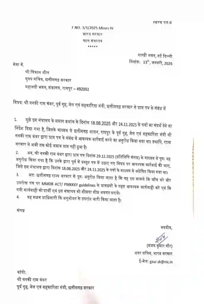 Korba News: छत्तीसगढ़ के पूर्व गृहमंत्री और भाजपा के कद्दावर आदिवासी नेता ननकीराम कंवर की एक शिकायत ने प्रशासनिक गलियारों में हड़कंप मचा दिया है। कोरबा के बालको क्षेत्र में सड़क निर्माण को लेकर मचे इस घमासान पर अब केंद्र सरकार ने कड़ा रुख अपनाया है। भारत सरकार ने छत्तीसगढ़ के मुख्य सचिव को एक रिमाइंडर (स्मरण पत्र) भेजकर इस मामले में की गई कार्रवाई की जानकारी मांगी है। दरअसल, ननकीराम कंवर ने आरोप लगाया था कि जो काम निजी कंपनी को अपने बजट से करना चाहिए था, उसे सरकारी फंड से कराकर कंपनी को अनुचित लाभ पहुंचाया जा रहा है। केंद्र की इस सख्ती के बाद अब राज्य शासन की जवाबदेही बढ़ गई है।