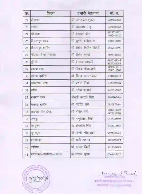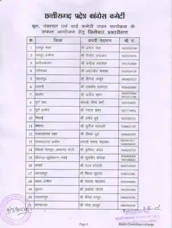 पार्टी द्वारा जारी आधिकारिक आदेश के मुताबिक, रायपुर शहर जैसी महत्वपूर्ण जिम्मेदारी पूर्व विधायक अरुण वोरा को दी गई है। वहीं, राजधानी के ग्रामीण इलाकों में संगठन को धार देने का जिम्मा शैलेश नितिन त्रिवेदी को सौंपा गया है। बिलासपुर शहर की जिम्मेदारी सुबोध हरितवाल को मिली है, जबकि बलौदा बाजार जिले के लिए कन्हैया अग्रवाल को प्रभारी नियुक्त किया गया है। ये प्रभारी अब जिला अध्यक्षों के साथ मिलकर हर वार्ड और पंचायत में मजबूत कमेटियां बनाएंगे। पार्टी नेतृत्व को उम्मीद है कि इस नई टीम के जरिए कांग्रेस गांव-गांव तक अपना नेटवर्क दोबारा खड़ा करने में सफल रहेगी।
