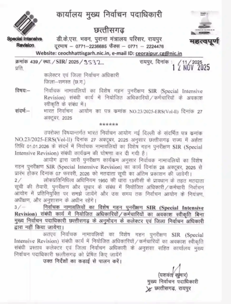 SIR कार्य में नियोजित अधिकारियों/कर्मचारियों का अवकाश अब सीधे कलेक्टर या जिला निर्वाचन अधिकारी द्वारा स्वीकृत नहीं किया जाएगा। अवकाश स्वीकृति के लिए कलेक्टर एवं जिला निर्वाचन अधिकारी की अनुशंसा सहित प्रस्ताव को मुख्य निर्वाचन पदाधिकारी, छत्तीसगढ़ के कार्यालय को अनुमोदन (Approval) के लिए प्रेषित किया जाएगा। आयोग ने सभी कलेक्टर्स को इन निर्देशों का कड़ाई से पालन सुनिश्चित करने का निर्देश दिया है।
