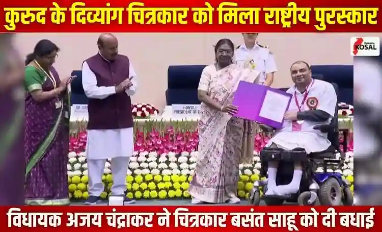 धमतरी: छत्तीसगढ़ के धमतरी जिले के कुरुद निवासी और देशभर में अपनी कला के लिए पहचाने जाने वाले दिव्यांग चित्रकार बसंत साहू को राष्ट्रपति द्रौपदी मुर्मू ने अंतर्राष्ट्रीय दिव्यांगजन दिवस के अवसर पर सम्मानित किया। सामाजिक न्याय एवं अधिकारिता मंत्रालय, भारत सरकार द्वारा दिए जाने वाले राष्ट्रीय दिव्यांगजन सशक्तिकरण पुरस्कार 2025 के तहत उन्हें ‘सर्वश्रेष्ठ दिव्यांगजन कलाकार’ की श्रेणी में यह प्रतिष्ठित पुरस्कार प्रदान किया गया। यह सम्मान 3 दिसंबर को नई दिल्ली के विज्ञान भवन में आयोजित समारोह में दिया गया।