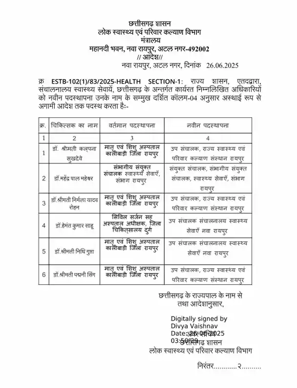 CG Transfer News: छत्तीसगढ़ सरकार ने स्वास्थ्य विभाग में प्रशासनिक फेरबदल करते हुए तबादले का आदेश जारी किया है इस ट्रांसफर लिस्ट में डॉक्टरों और स्वास्थ्य अधिकारियों के नाम शामिल है। जिन्हे अलग-अलग स्थानो में नई जिम्मेदारी सौंपी गई है।