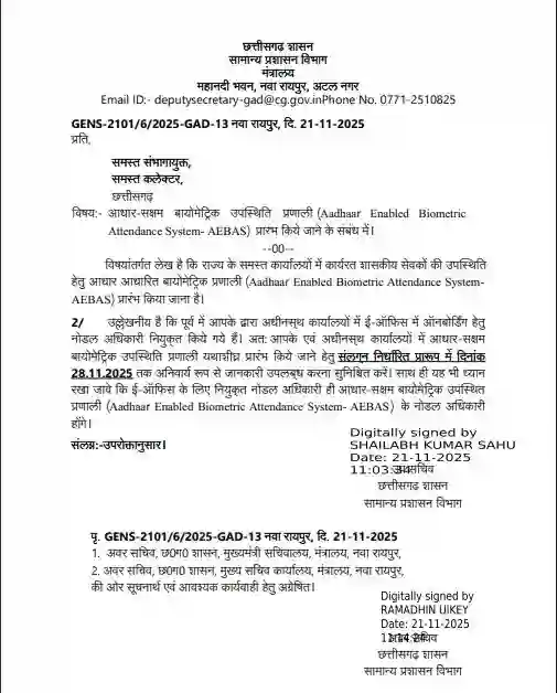 रायपुर: छत्तीसगढ़ सरकार ने प्रशासनिक पारदर्शिता और समयपालन को मजबूत करने के लिए एक बड़ा और महत्वपूर्ण कदम उठाया है। सामान्य प्रशासन विभाग (GAD) ने 21 नवंबर को एक नया आदेश जारी कर दिया है, जिसके तहत प्रदेश के सभी सरकारी कार्यालयों में अब आधार-आधारित बायोमेट्रिक उपस्थिति प्रणाली (AEBAS) को अनिवार्य रूप से लागू किया जाएगा। इसके लिए जीएडी ने सभी संभागायुक्तों और कलेक्टरों को इस प्रक्रिया को तेज करने के निर्देश दिए हैं।