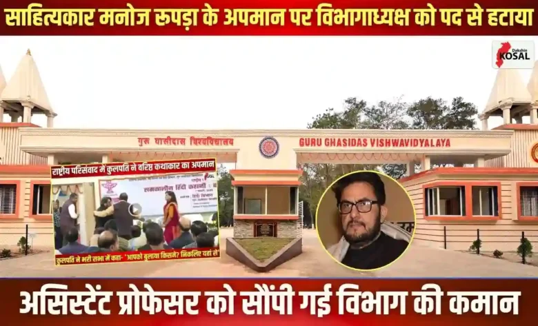 बिलासपुर स्थित गुरु घासीदास केंद्रीय विश्वविद्यालय (GGU) में वरिष्ठ साहित्यकार मनोज रूपड़ा को अपमानित करने का मामला अब बड़ा रूप ले चुका है। राष्ट्रीय परिसंवाद के दौरान हुई इस अभद्रता का वीडियो वायरल होने के बाद चौतरफा दबाव में आए विश्वविद्यालय प्रशासन ने पहली बड़ी कार्रवाई की है। हिंदी विभाग की विभागाध्यक्ष डॉ. गौरी त्रिपाठी को उनके पद से तत्काल प्रभाव से हटा दिया गया है। उनकी जगह विभाग के ही असिस्टेंट प्रोफेसर रमेश गोहे को विभाग की कमान सौंपी गई है। माना जा रहा है कि साहित्य जगत में बढ़ते आक्रोश को शांत करने के लिए यह कदम उठाया गया है।