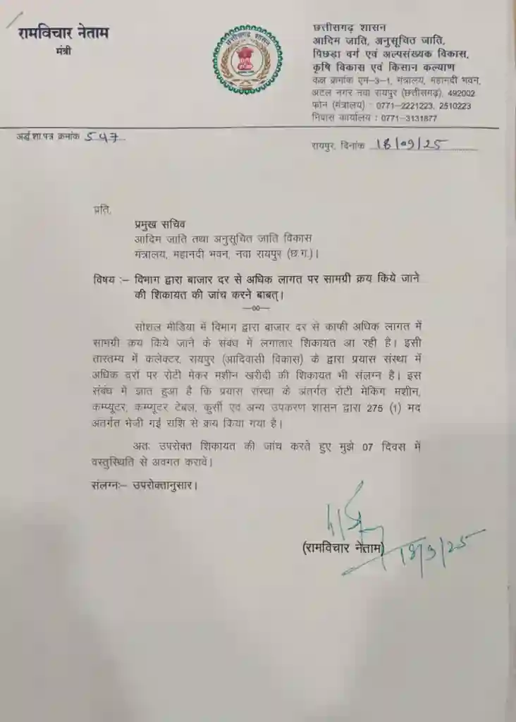 रायपुर: छत्तीसगढ़ के आदिम जाति विकास विभाग में हुई एक खरीदी पर गंभीर सवाल खड़े हो गए हैं। बाजार में लगभग 20 हजार रुपए में मिलने वाली रोटी मेकिंग मशीन को विभाग ने सरकारी ई-कॉमर्स पोर्टल GeM से करीब 8 लाख रुपए में खरीदा। यह मामला सामने आने के बाद कृषि एवं आदिम जाति विकास मंत्री रामविचार नेताम ने 18 सितंबर को जांच का आदेश जारी किया था। उन्होंने प्रमुख सचिव को स्पष्ट निर्देश दिए थे कि 7 दिनों के भीतर जांच करके वस्तुस्थिति से अवगत कराया जाए। हालांकि मंत्री के आदेश के 14 सप्ताह बीत जाने के बावजूद भी विभाग ने जांच रिपोर्ट की पुष्टि या सार्वजनिक जानकारी नहीं दी है।