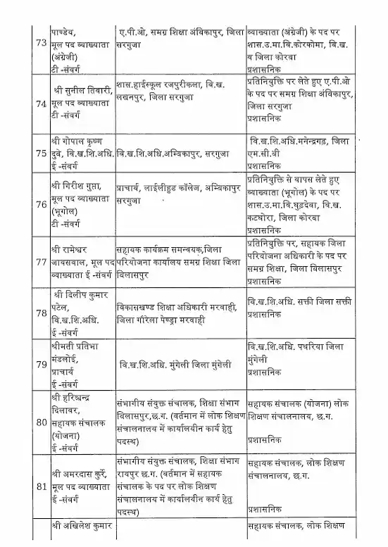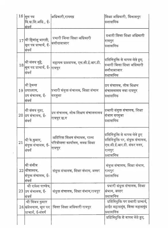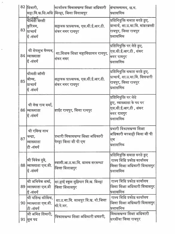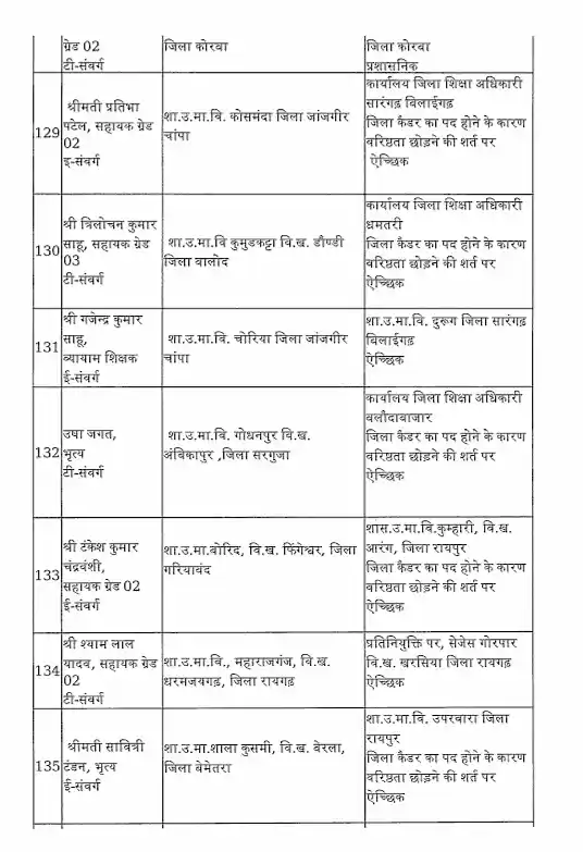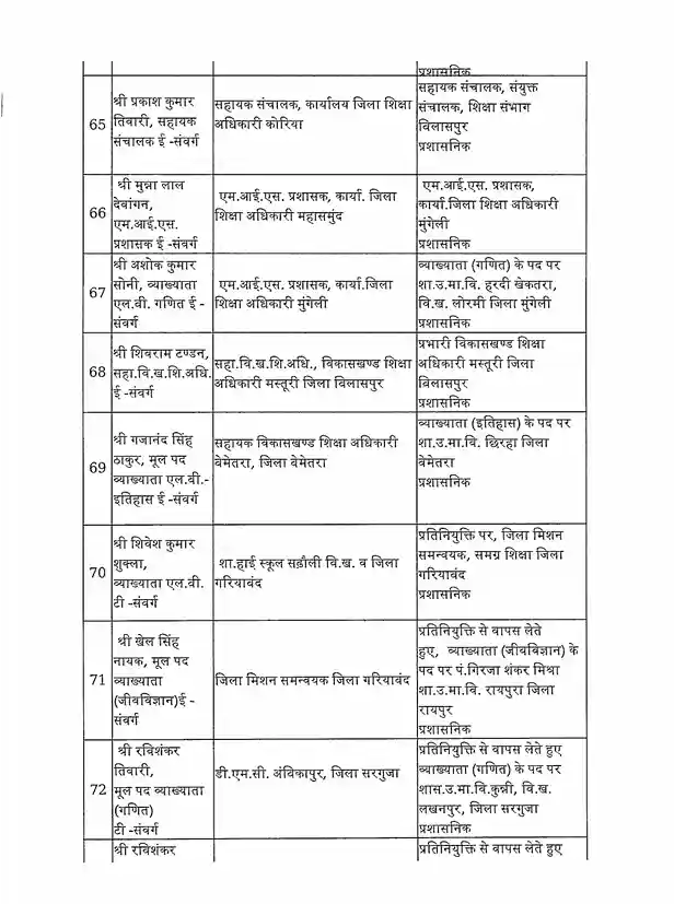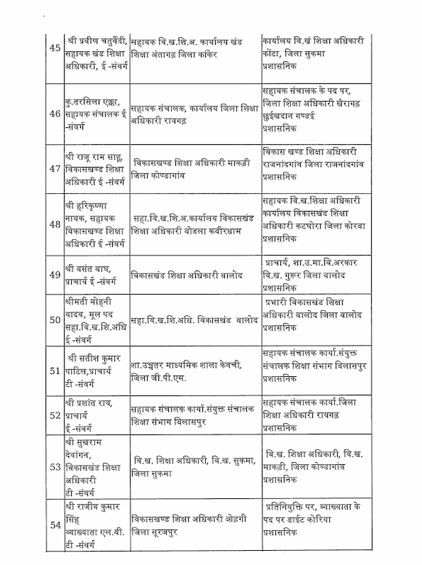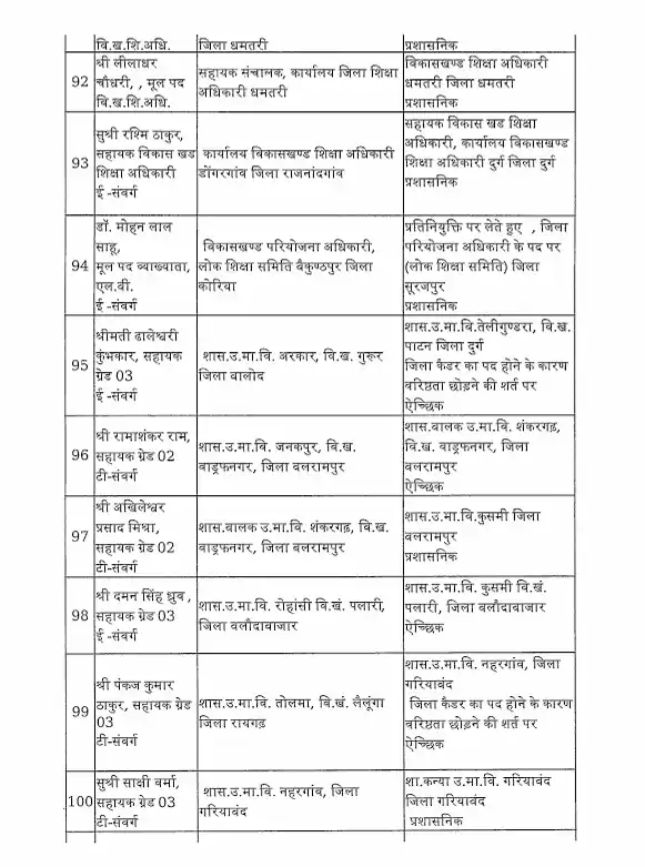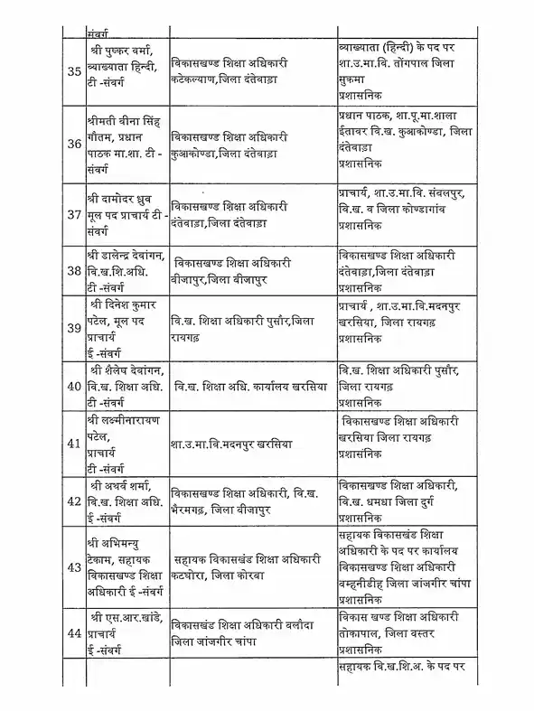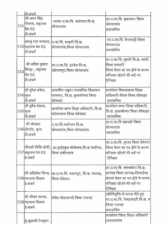 तबादला सूची के अनुसार, रायपुर जिले में हिमांशु भारती को नया जिला शिक्षा अधिकारी (DEO) नियुक्त किया गया है। यह कदम प्रशासनिक दक्षता और शैक्षिक व्यवस्था को सुदृढ़ करने के उद्देश्य से उठाया गया है।