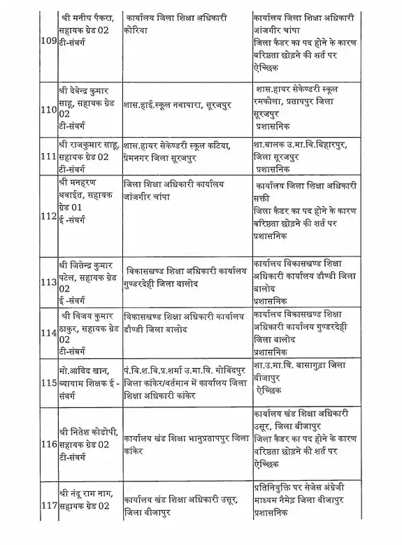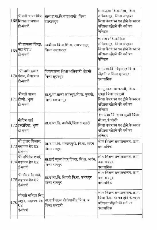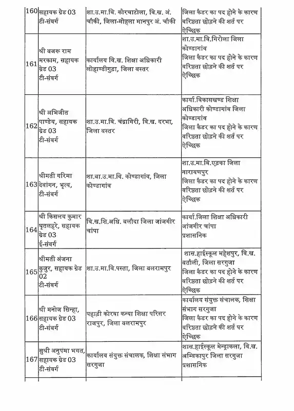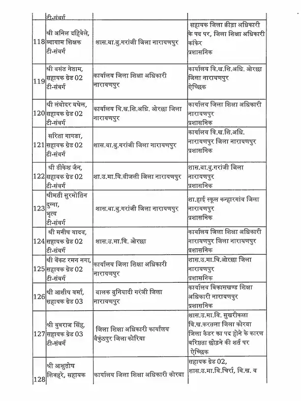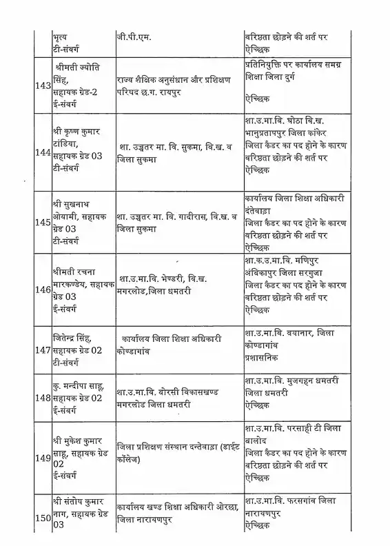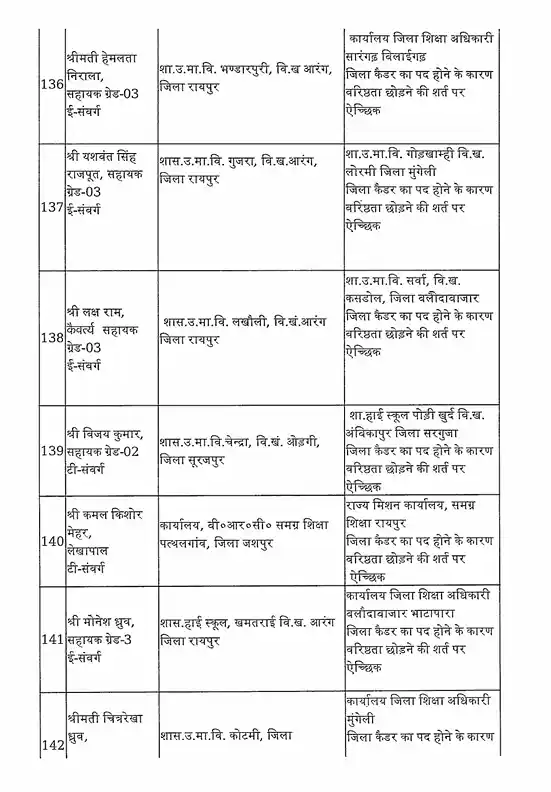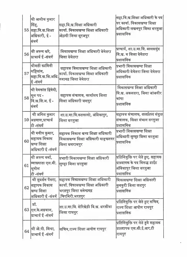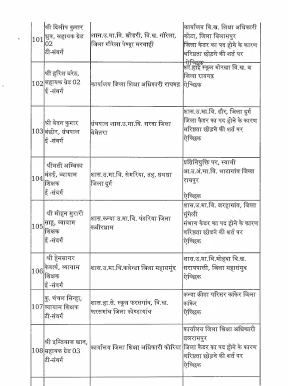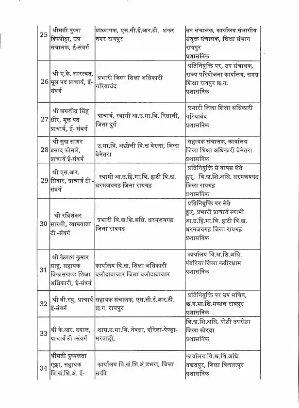 तबादला सूची के अनुसार, रायपुर जिले में हिमांशु भारती को नया जिला शिक्षा अधिकारी (DEO) नियुक्त किया गया है। यह कदम प्रशासनिक दक्षता और शैक्षिक व्यवस्था को सुदृढ़ करने के उद्देश्य से उठाया गया है।