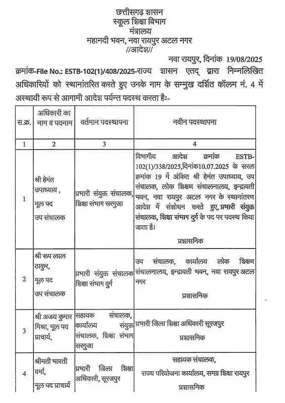 जारी सूची के मुताबिक, हेमंत उपाध्याय, जो वर्तमान में उप संचालक के पद पर कार्यरत हैं, उन्हें दुर्ग संभाग का प्रभारी संयुक्त संचालक नियुक्त किया गया है। शिक्षा विभाग की तरफ से यह आदेश सोमवार को जारी किया गया। इन तबादलों को क्षेत्रीय प्रशासनिक जरूरतों और विभागीय कार्यों की सुचारुता को ध्यान में रखते हुए किया गया है।
