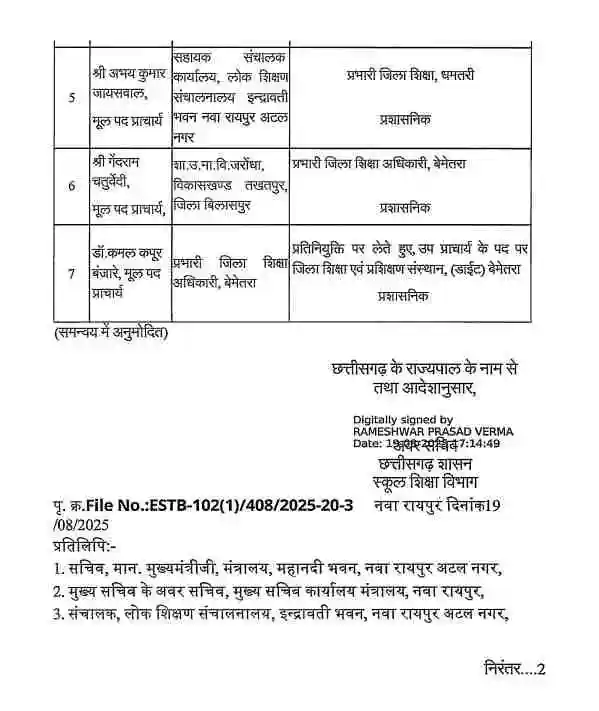 रायपुर CG Education Department Transfer: छत्तीसगढ़ के स्कूल शिक्षा विभाग ने प्रशासनिक फेरबदल करते हुए अधिकारियों के तबादले के आदेश जारी किए हैं। इस बदलाव के तहत कई प्राचार्यों को जिला शिक्षा अधिकारी (DEO) की जिम्मेदारी सौंपी गई है।