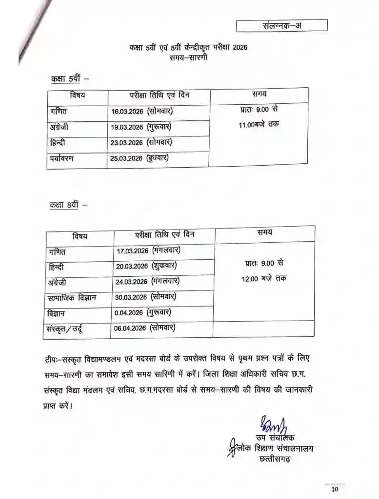 छत्तीसगढ़ लोक शिक्षा संचालनालय ने प्रदेश के सरकारी स्कूलों में पढ़ने वाले बच्चों के लिए कक्षा 5वीं और 8वीं की वार्षिक परीक्षा का टाइम टेबल जारी कर दिया है। इस साल की सबसे बड़ी खबर यह है कि ये परीक्षाएं पूरी तरह से बोर्ड पैटर्न पर आयोजित की जाएंगी। जारी कार्यक्रम के अनुसार, कक्षा 5वीं की परीक्षाएं 16 मार्च से शुरू होंगी, जबकि 8वीं कक्षा के छात्र 17 मार्च से अपना पहला पेपर देंगे। सभी परीक्षाएं सुबह 9:00 बजे से प्रारंभ होंगी। संचालनालय ने इस संबंध में सभी जिला शिक्षा अधिकारियों को तैयारी पूरी करने के निर्देश भेज दिए हैं। हालांकि, यह स्पष्ट किया गया है कि सीबीएसई (CBSE) और आईसीएसई (ICSE) स्कूलों के विद्यार्थियों पर यह नियम लागू नहीं होगा।