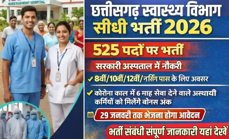 CG Swasthya Vibhag Vacancy 2026: छत्तीसगढ़ के बस्तर जिले में स्वास्थ्य विभाग के अंतर्गत तृतीय और चतुर्थ श्रेणी के कुल 525 पदों पर सीधी भर्ती की प्रक्रिया शुरू कर दी गई है। यह भर्ती संचालनालय स्वास्थ्य सेवाएं, छत्तीसगढ़ द्वारा की जा रही है और जिले के सीएमएचओ कार्यालय के माध्यम से संचालित होगी। इस भर्ती की सबसे बड़ी खासियत यह है कि कोरोना काल में 6 माह सेवा देने वाले अस्थायी स्वास्थ्य कर्मियों को बोनस अंक दिए जाएंगे, जिससे उन्हें चयन में विशेष लाभ मिलेगा।