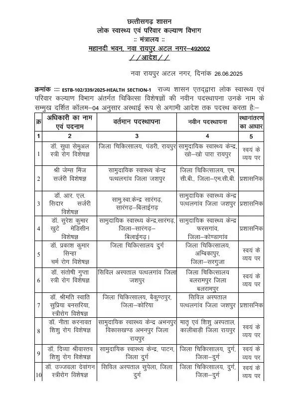 CG Medical Experts Transfer List: राज्य सरकार ने जारी किया स्वास्थ्य विभाग के चिकित्सक विशेषज्ञों का ट्रांसफर लिस्ट