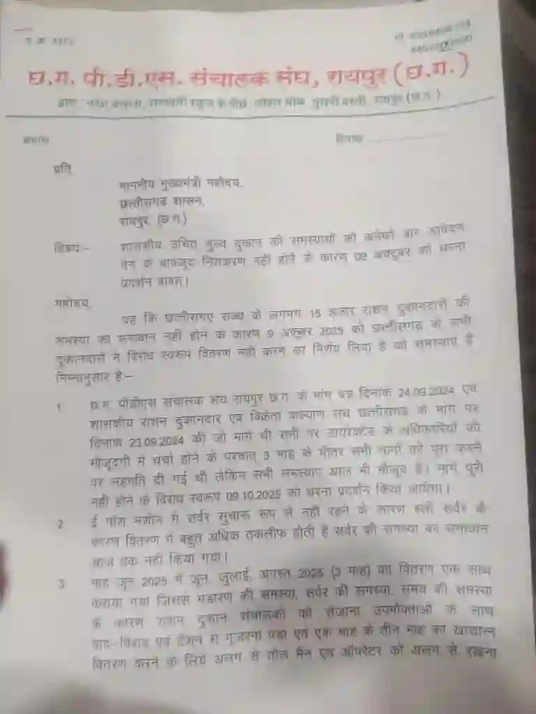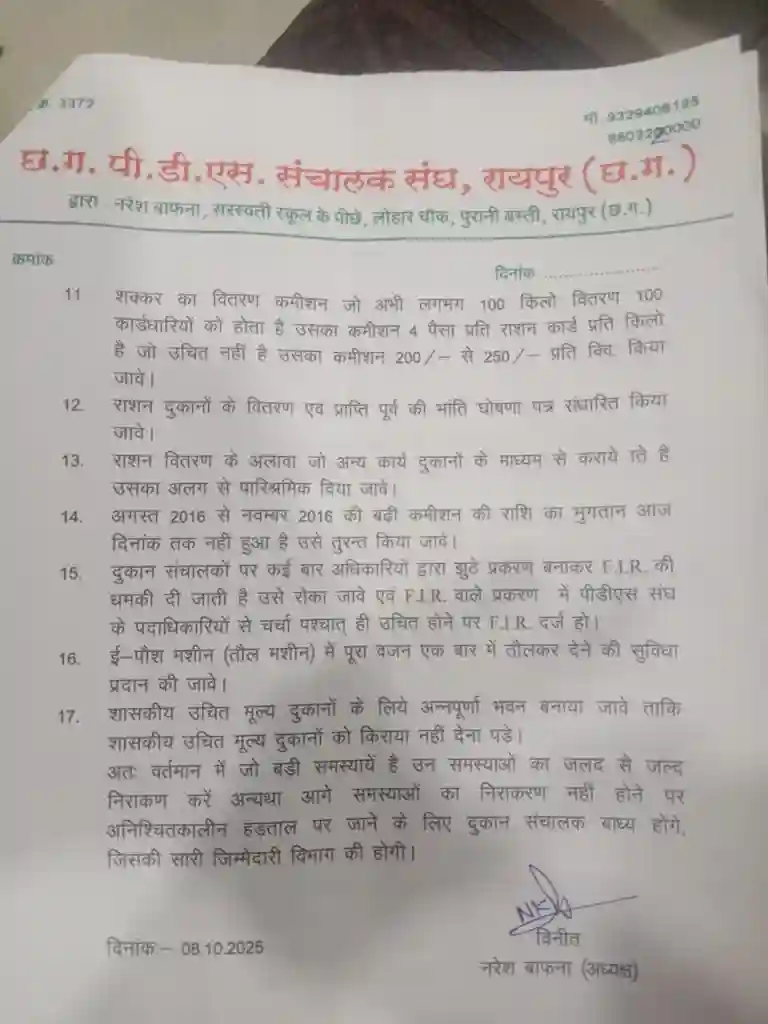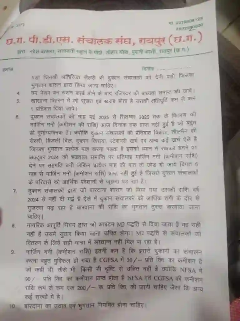 छत्तीसगढ़ PDS संचालक संघ ने साफ चेतावनी दी है कि अगर उनकी 17 सूत्रीय मांगों का समाधान तत्काल नहीं किया गया, तो सभी राशन दुकानदार वितरण बंद कर अनिश्चितकालीन हड़ताल पर जाने के लिए बाध्य होंगे। संघ ने कहा है कि ऐसी स्थिति में होने वाली समस्त जिम्मेदारी विभाग की होगी।