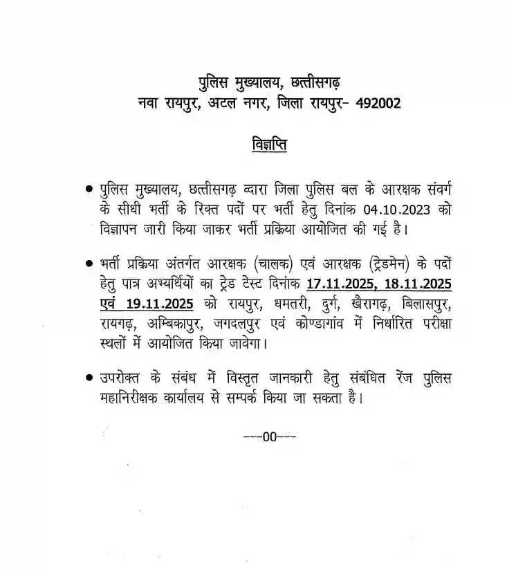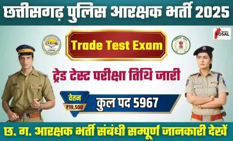 Trade Test Exam Date 2025: छत्तीसगढ़ पुलिस आरक्षक भर्ती के तहत ट्रेड टेस्ट परीक्षा का आयोजन 17 से 19 नवंबर 2025 के बीच किया जाएगा। यह परीक्षा राज्य के 8 जिलों में एक साथ संपन्न होगी —