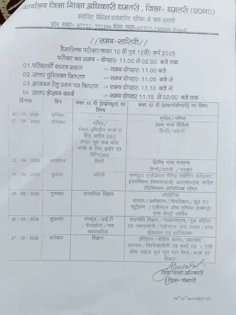 धमतरी: CG School Exam Time Table: जिला शिक्षा अधिकारी (DEO) कार्यालय ने कक्षा 1 से 12 तक संचालित सभी शासकीय एवं अशासकीय विद्यालयों के लिए त्रैमासिक परीक्षा की समय-सारणी जारी कर दी है। आगामी 15 सितंबर 2025 से पूरे जिले में सीजी बोर्ड पाठ्यक्रम आधारित विद्यालयों में तिमाही परीक्षाएँ एक साथ प्रारंभ होंगी।