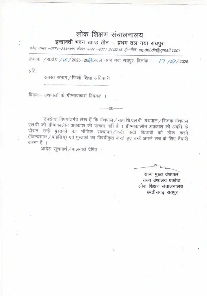 CG School Teacher Holidays News: छत्तीसगढ़ में अब कुछ शिक्षकों को गर्मी की छुट्टियों का लाभ नहीं मिलेगा। स्कूल शिक्षा विभाग के डीपीआई (निदेशालय लोक शिक्षण) ने इस संबंध में आदेश जारी किया है। आदेश के अनुसार, सहायक शिक्षक एलबी ग्रंथपाल, शिक्षक ग्रंथपाल और ग्रंथपाल वर्ग के कर्मचारियों को गर्मी की छुट्टी में भी स्कूल आकर कार्य करना होगा।