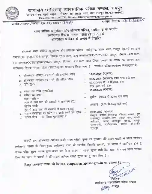 राज्य शैक्षिक अनुसंधान एवं प्रशिक्षण परिषद, रायपुर द्वारा जारी अधिसूचना के अनुसार CG TET 2026 की ऑनलाइन आवेदन प्रक्रिया 13 नवंबर 2025 से शुरू होगी और 8 दिसंबर 2025 (सायं 5:00 बजे तक) चलेगी।