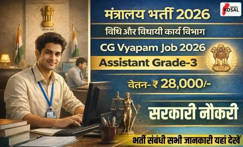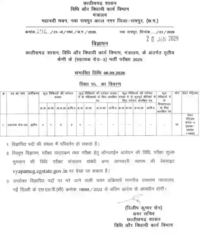 Assistant Grade-3 Bharti 2026: छत्तीसगढ़ शासन के विधि और विधायी कार्य विभाग (मंत्रालय) में सहायक ग्रेड-3 (Assistant Grade-III) के रिक्त पदों पर भर्ती के लिए शॉर्ट विज्ञापन जारी किया गया है। इस भर्ती प्रक्रिया का आयोजन छत्तीसगढ़ व्यावसायिक परीक्षा मंडल (CG Vyapam) द्वारा किया जाएगा। विस्तृत विज्ञापन और ऑनलाइन आवेदन प्रक्रिया जल्द शुरू होगी। इस भर्ती के लिए लिखित परीक्षा 06 सितंबर 2026 को आयोजित की जाएगी।