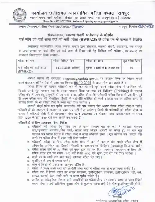 दिनांक 06 अक्टूबर 2025 को छत्तीसगढ़ व्यापम द्वारा वार्ड ब्वॉय एवं आया परीक्षा के लिए एडमिट कार्ड जारी कर दिया गया है।