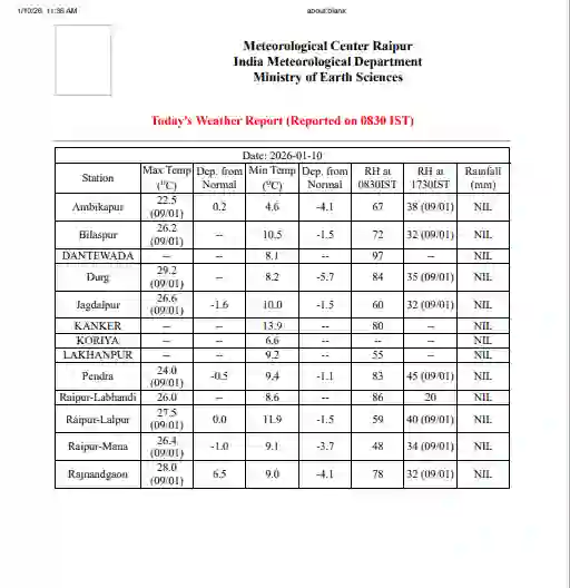 Raipur Weather Update: राजधानी रायपुर के मौसम में इस बार एक अजीब अंतर देखा जा रहा है। रायपुर मुख्य शहर का न्यूनतम तापमान सामान्य से 2 डिग्री कम है लेकिन शहर से महज 10 किलोमीटर दूर माना एयरपोर्ट इलाके में पारा सामान्य से 5 डिग्री नीचे चला गया है। इसका मतलब है कि शहर के बाहरी इलाकों में ठंड का प्रकोप शहर के भीतर की तुलना में कहीं ज्यादा है। शनिवार को रायपुर में न्यूनतम तापमान 12 डिग्री सेल्सियस के आसपास रहने का अनुमान है। सुबह के वक्त हल्की धुंध छाई रहेगी और शाम ढलते ही ठंडी हवाओं के कारण लोगों को अलाव और भारी गर्म कपड़ों का सहारा लेना पड़ रहा है।