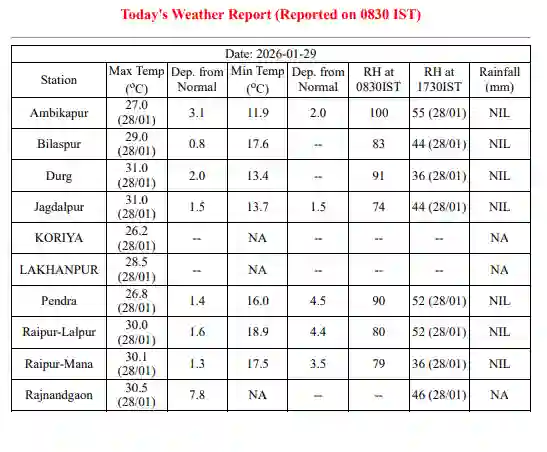Today CG Weather News: बीते 24 घंटों के आंकड़ों को देखें तो प्रदेश में तापमान का भारी अंतर देखने को मिल रहा है। अंबिकापुर 10.8 डिग्री सेल्सियस के साथ सबसे ठंडा शहर रहा। वहीं इसके उलट दुर्ग और जगदलपुर में अधिकतम तापमान 31 डिग्री तक पहुंच गया जिससे वहां लोगों को हल्की गर्मी का अहसास हुआ। रायपुर के माना एयरपोर्ट पर न्यूनतम तापमान सामान्य से करीब 1.4 डिग्री नीचे रहा। मौसम विभाग के मुताबिक आने वाले दिनों में उत्तर से आने वाली बर्फीली हवाएं मैदानी इलाकों में भी असर दिखा सकती हैं जिससे रात के वक्त ठंड फिर से रफ्तार पकड़ेगी।