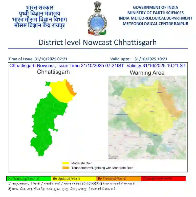 मौसम विभाग ने प्रदेश के कई इलाकों के लिए अगले 3 घंटों हेतु बारिश का अलर्ट जारी किया है। जशपुर और बलरामपुर में बादल गरजने, आकाशीय बिजली और तेज हवा (30-40 KMPH) के साथ मध्यम वर्षा की संभावना है। वहीं, रायगढ़, कोरबा, गौरेला-पेंड्रा मरवाही, सुरगुजा, सूरजपुर और कोरिया में भी मध्यम बारिश हो सकती है, जिससे करीब 11 जिले प्रभावित होंगे।