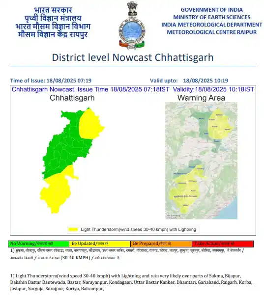 मध्य और दक्षिण छत्तीसगढ़ में भारी वर्षा की चेतावनी