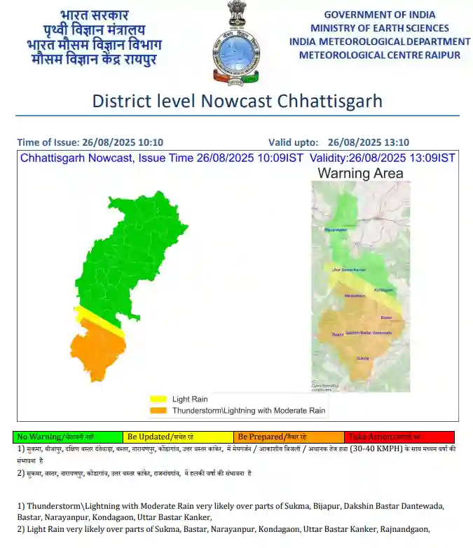 वहीं दूसरी ओर, सुकमा, बीजापुर, बस्तर, नारायणपुर, कोंडागांव, उत्तर बस्तर कांकेर, रायगढ़, बिलासपुर, कोरबा, गौरेला-पेंड्रा-मरवाही, मुंगेली, सुरगुजा, सूरजपुर, कोरिया और बलरामपुर में हल्की से मध्यम बारिश के आसार हैं। इन जिलों में यलो अलर्ट जारी किया गया है।