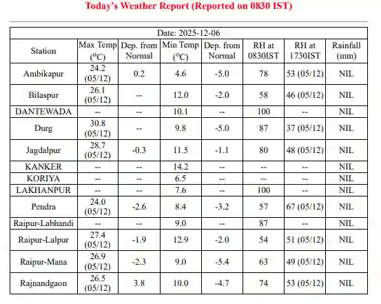 Today CG Weather News: छत्तीसगढ़ में मौसम ने करवट ली है और राजधानी रायपुर सहित प्रदेश में अगले दो दिनों में ठंड और बढ़ने की संभावना जताई गई है। कई जिलों के तापमान में पहले ही काफी गिरावट दर्ज की जा चुकी है। बलरामपुर में न्यूनतम तापमान 8 डिग्री, कोरबा में 10, राजनांदगांव में 11, दुर्ग में 11 और बिलासपुर में 13 डिग्री तक पहुँच गया है। मौसम विभाग ने प्रदेश के कई जिलों में कड़ाके की ठंड पड़ने का अनुमान जताया है।