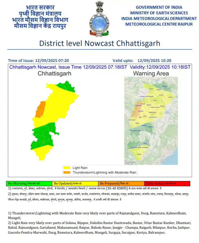 IMD Alert: मौसम विभाग ने अगले तीन घंटों के लिए राजनांदगांव, दुर्ग, बेमेतरा, कबीरधाम और मुंगेली जिलों में तेज बारिश, आकाशीय बिजली और 30-40 किलोमीटर प्रति घंटे की रफ्तार से तेज हवाएं चलने की चेतावनी दी है। इन जिलों के लिए ऑरेंज अलर्ट जारी किया गया है। वहीं रायगढ़, महासमुंद, धमतरी, बालोद, गरियाबंद समेत कई जिलों में हल्की से मध्यम वर्षा होने की संभावना है, जिसके लिए येलो अलर्ट जारी किया गया है।