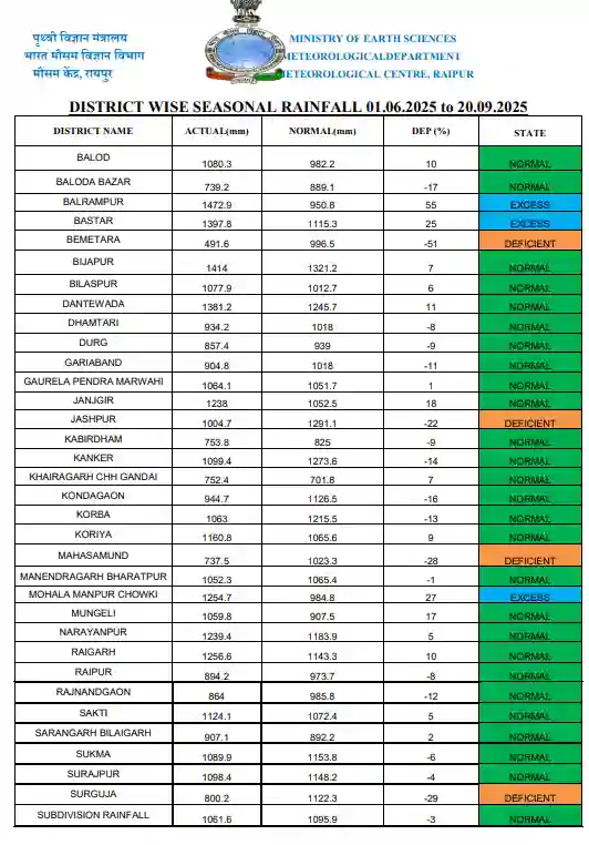 - रायपुर, दुर्ग और बस्तर संभागों के कुछ स्थानों पर बहुत हल्की बारिश दर्ज की गई।