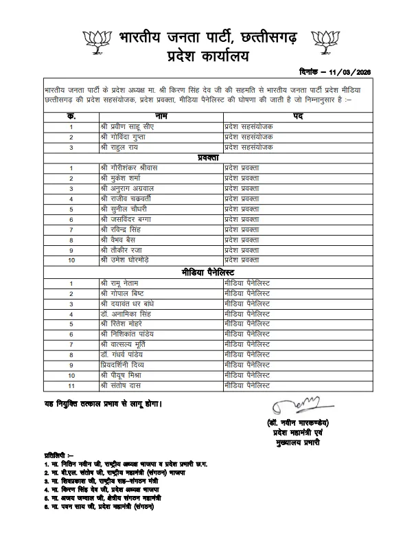 अनुराग अग्रवाल, गौरीशंकर श्रीवास और राजीव चक्रवर्ती समेत कुल 10 नेताओं को प्रदेश प्रवक्ता बनाया गया है। प्रवीण साहू, गोविंदा गुप्ता और राहुल राय को प्रदेश सहसंयोजक की जिम्मेदारी मिली है। संगठन ने मीडिया विभाग को और अधिक आक्रामक और सक्रिय बनाने के लिए 11 मीडिया पैनलिस्ट भी नियुक्त किए हैं, जो अलग-अलग मीडिया प्लेटफॉर्म्स पर सरकार की योजनाओं और संगठन के विचारों को जनता तक पहुंचाने का काम करेंगे।