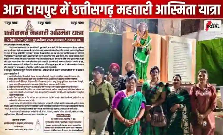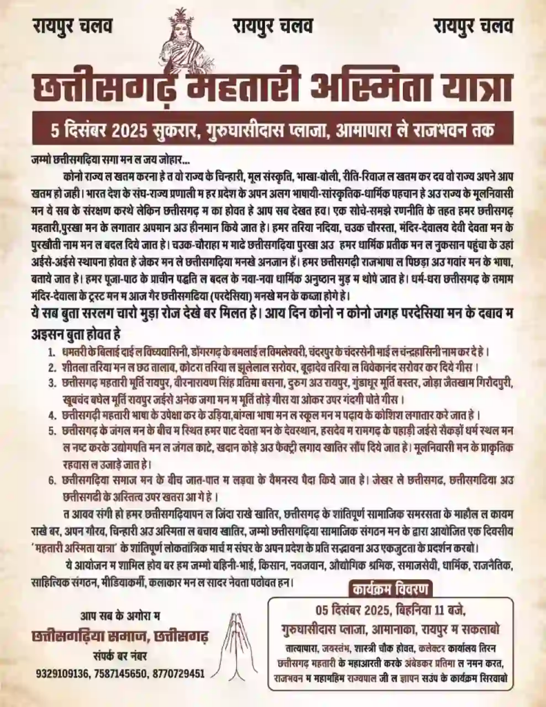 रायपुर: छत्तीसगढ़ महतारी अस्मिता यात्रा आज, 5 दिसंबर 2025 (शुक्रवार) को राजधानी रायपुर में निकाली जाएगी। यह पदयात्रा सुबह 11 बजे गुरु घासीदास प्लाजा, आमापारा से शुरू होगी और राजभवन तक जाएगी। छत्तीसगढ़िया क्रांति सेना के युवा संगठन के प्रदेश अध्यक्ष शिवेंद्र वर्मा ने समस्त छत्तीसगढ़िया समाज से इस यात्रा में एकजुट होने की अपील की है। यह यात्रा राज्य की धार्मिक, सांस्कृतिक और भाषाई पहचान तथा मान-सम्मान की रक्षा के उद्देश्य से आयोजित की जा रही है।