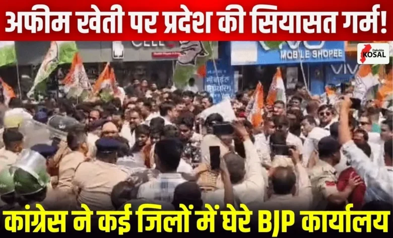 छत्तीसगढ़ की शांत फिजाओं में इन दिनों अफीम की अवैध खेती को लेकर सियासी तूफान उठा हुआ है। दुर्ग जिले से शुरू हुआ यह मामला अब पूरे प्रदेश में आग की तरह फैल गया है। नशे के इस काले कारोबार के खुलासे के बाद कांग्रेस ने साय सरकार के खिलाफ मोर्चा खोल दिया है। गुरुवार को कांग्रेस कार्यकर्ताओं ने प्रदेश के लगभग सभी जिलों में भाजपा कार्यालयों का घेराव किया। कांग्रेस का सीधा आरोप है कि प्रदेश में अफीम की खेती और नशे का व्यापार सत्ताधारी दल के संरक्षण में फल-फूल रहा है। कई जगहों पर प्रदर्शन इतना उग्र रहा कि पुलिस और कार्यकर्ताओं के बीच जमकर झूमाझटकी हुई।