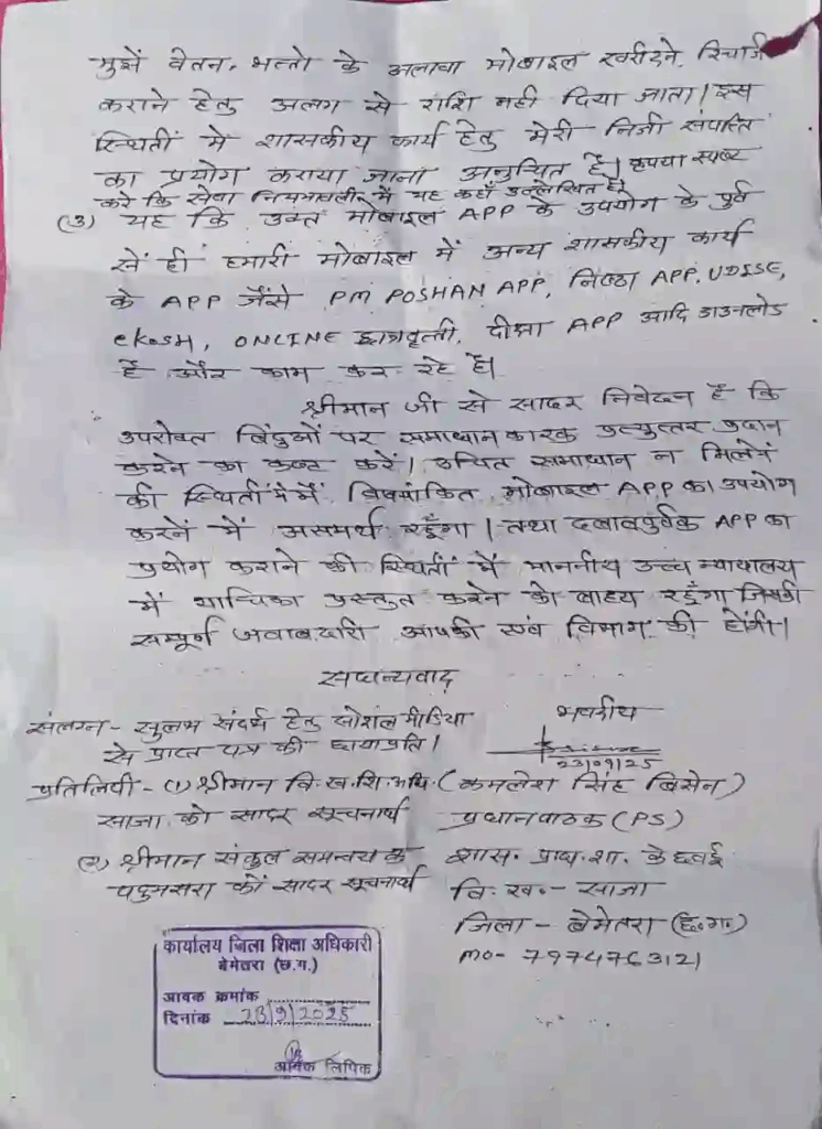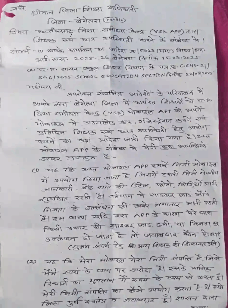 Bemetara School News: बेमेतरा जिले के शासकीय प्राथमिक शाला केछवई के हेड मास्टर कमलेश सिंह बिसेन ने अपने पत्र में ‘VSK’ ऐप के इस्तेमाल को लेकर कई गंभीर सवाल उठाए हैं। उन्होंने कहा कि यह ऐप शिक्षकों और छात्रों की उपस्थिति दर्ज करने के लिए निजी मोबाइल में डाउनलोड कराया जा रहा है। इससे उनकी व्यक्तिगत जानकारी, बैंक डिटेल्स, फोटो और वीडियो जैसी गोपनीय चीजें खतरे में पड़ सकती हैं।