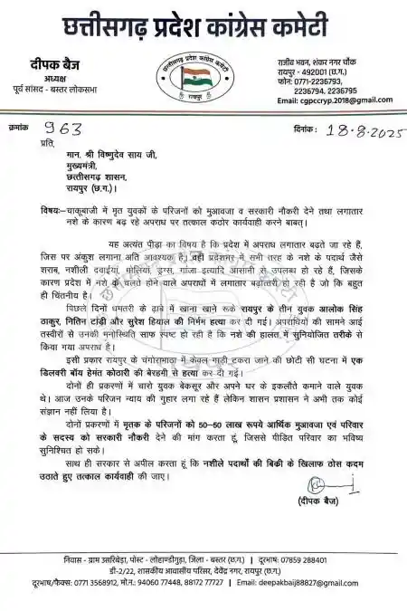 Dipak Baij letter to CM: अपने पत्र में दीपक बैज ने लिखा है कि राज्य में नशे की बढ़ती उपलब्धता से जुड़ी घटनाएं चिंताजनक स्तर पर पहुंच गई हैं। उन्होंने कहा कि शराब, नशीली गोलियां, ड्रग्स, गांजा और अन्य नशीले पदार्थ प्रदेश में आसानी से उपलब्ध हो रहे हैं, जिसके कारण अपराध लगातार बढ़ रहे हैं। उन्होंने सरकार से मांग की कि नशीले पदार्थों की बिक्री पर तत्काल सख्त रोक लगाई जाए।