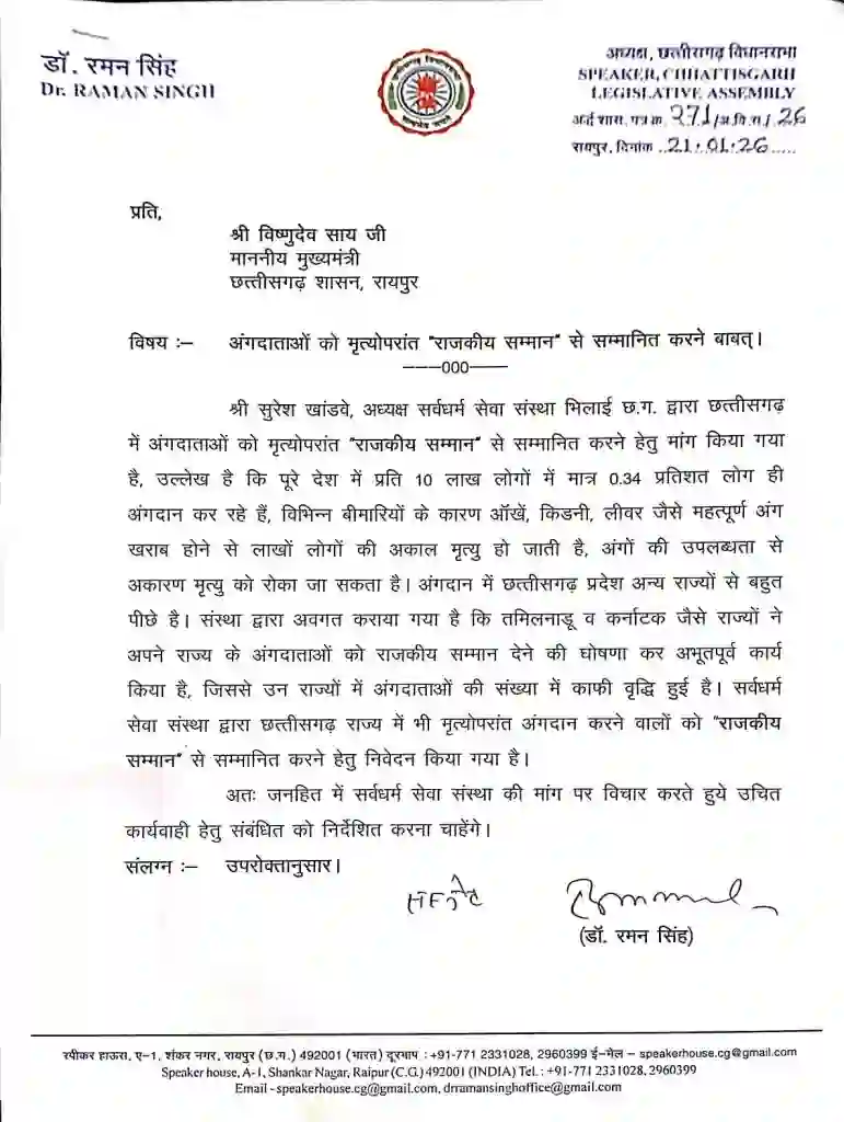 छत्तीसगढ़ विधानसभा के अध्यक्ष डॉ. रमन सिंह ने राज्य में अंगदान को बढ़ावा देने के लिए एक बड़ी मानवीय पहल की है। उन्होंने मुख्यमंत्री विष्णुदेव साय को एक औपचारिक पत्र लिखकर मांग की है कि मृत्यु के बाद अंगदान करने वाले नागरिकों को “राजकीय सम्मान” के साथ अंतिम विदाई दी जाए। डॉ. सिंह का मानना है कि यदि सरकार अंगदान करने वालों को यह विशेष सम्मान देती है तो इससे समाज में एक सकारात्मक संदेश जाएगा और लोग दूसरों को नई जिंदगी देने के लिए प्रेरित होंगे। इस प्रस्ताव को प्रदेश में स्वास्थ्य के क्षेत्र में एक क्रांतिकारी कदम माना जा रहा है।