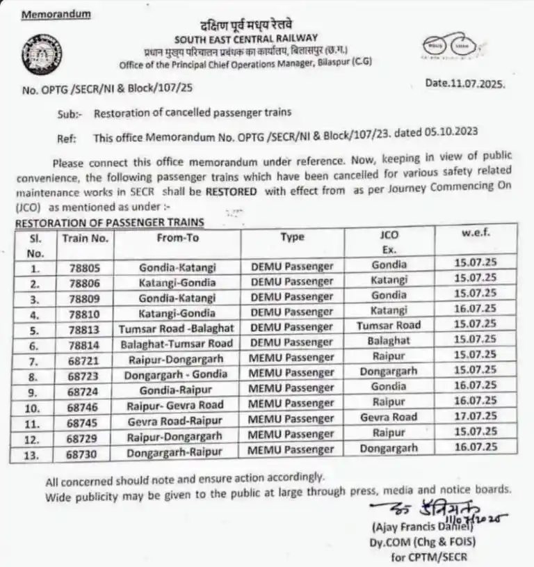 रायपुर: CG Passenger Train Started: पांच साल पहले कोविड संक्रमण के दौरान सुरक्षा की दृष्टि से बंद की गई लोकल मेमू (MEMU) और डेमू (DEMU) पैसेंजर ट्रेनों का संचालन दक्षिण पूर्व मध्य रेलवे (SECR) द्वारा एक बार फिर शुरू किया जा रहा है। रेलवे प्रशासन ने 15 जुलाई 2025 से इन ट्रेनों को चरणबद्ध तरीके से बहाल करने का निर्णय लिया है। डेमू ट्रेन प्रारंभ
