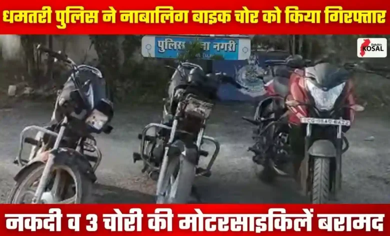 धमतरी में थाना नगरी पुलिस ने लगातार हो रही चोरी की घटनाओं पर कार्रवाई करते हुए एक नाबालिग को पकड़ लिया। पुलिस ने उसके पास से छह हजार तीन सौ रुपये नगद और तीन चोरी की गई मोटरसायकिलें जब्त की हैं। अधिकारी इसे हाल के दिनों में हुई वारदातों में महत्वपूर्ण सफलता मान रहे हैं।