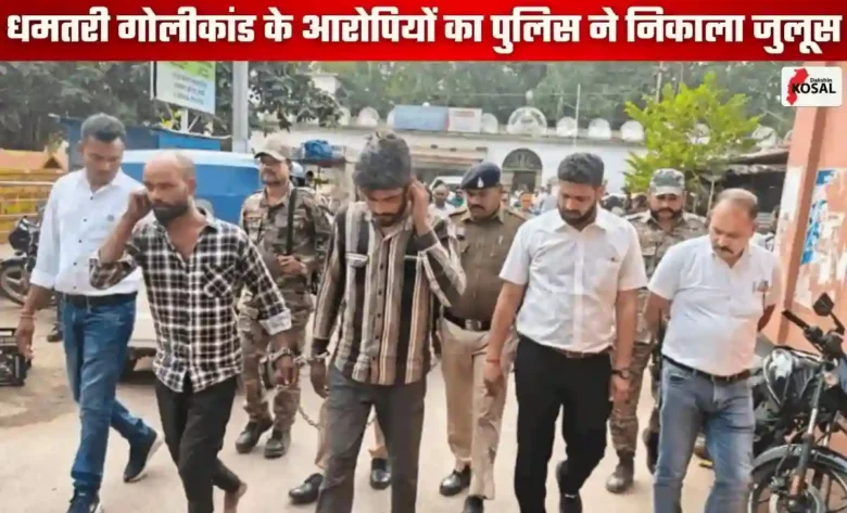 छत्तीसगढ़ के धमतरी में बरडिया ज्वेलर्स गोलीकांड के दो आरोपियों को गिरफ्तार करने के बाद पुलिस ने उनका शहर में जुलूस निकाला। इस दौरान दोनों आरोपी यह नारे लगाते दिखे कि अपराध करना पाप है और कानून हमारा बाप है। यह जुलूस देखते हुए शहर में पूरे दिन इस कार्रवाई की चर्चा बनी रही।
