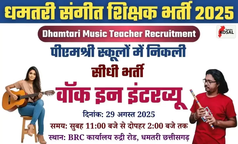 धमतरी: Dhamtari Music Teacher Recruitment: धमतरी जिले के पीएमश्री स्कूलों में संगीत प्रशिक्षकों की भर्ती के लिए वॉक-इन इंटरव्यू का आयोजन किया जा रहा है। कक्षा पहली से बारहवीं तक के लिए यह भर्ती राज्य परियोजना कार्यालय, समग्र शिक्षा रायपुर की स्वीकृति के बाद की जा रही है।