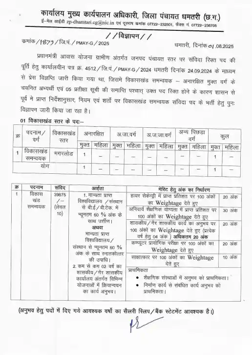 विकासखंड समन्वयक पद हेतु भर्ती विवरण (जिला पंचायत धमतरी): PMAY-G Block Coordinator Recruitment Details