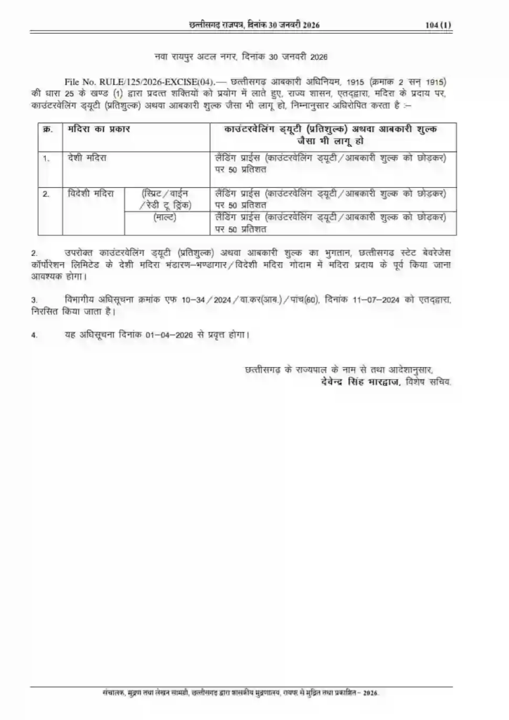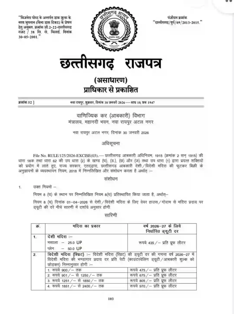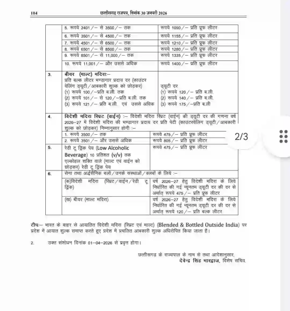 छत्तीसगढ़ में नई आबकारी नीति के लागू होते ही शराब की कीमतों में बढ़ोतरी तय हो गई है। साय सरकार ने शराब पर लगने वाली ड्यूटी दरों में इजाफा करने का फैसला लिया है। यह नया नियम 1 अप्रैल 2026 से पूरे प्रदेश में प्रभावी हो जाएगा। सरकार के इस कदम से देशी और विदेशी दोनों ही तरह की शराब के दाम बढ़ जाएंगे। इस संबंध में छत्तीसगढ़ राजपत्र में आधिकारिक अधिसूचना भी जारी कर दी गई है।