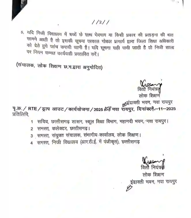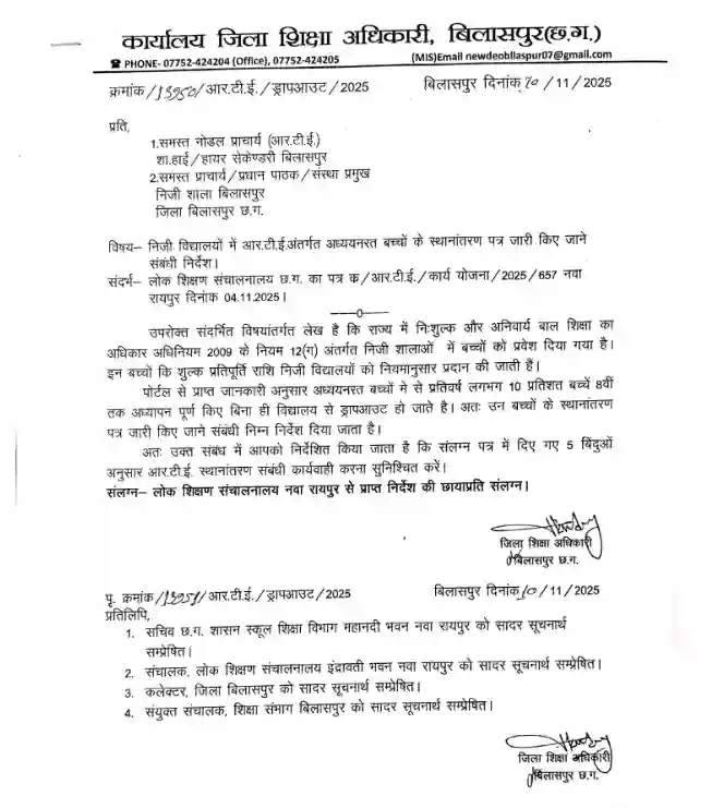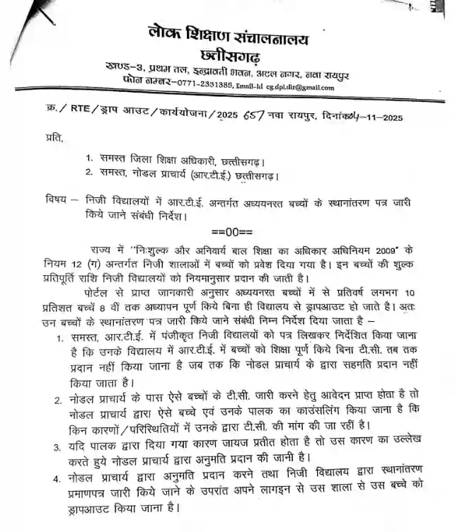 रायपुर: शिक्षा का अधिकार कानून RTE (Right to Education) के तहत निजी विद्यालयों में पढ़ने वाले छात्रों के संबंध में लोक शिक्षण संचालनालय (DPI) ने एक कड़ा आदेश जारी किया है। DPI ने प्रदेशभर के जिला शिक्षा अधिकारियों (DEO) को निर्देश दिया है कि जो बच्चे बीच में ही पढ़ाई छोड़ देते हैं (ड्रापआउट), उन्हें नोडल प्राचार्य की सहमति और अनुशंसा के बिना निजी स्कूल स्थानांतरण प्रमाण पत्र (TC) जारी नहीं कर सकते हैं। यह नियम बिलासपुर सहित पूरे छत्तीसगढ़ में सख्ती से लागू करने का निर्देश दिया गया है।