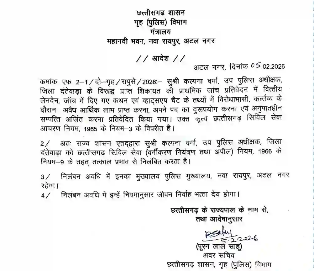 आधिकारिक आदेश के मुताबिक, निलंबन की अवधि के दौरान कल्पना वर्मा का मुख्यालय पुलिस नवा रायपुर अटल नगर तय किया गया है। विभाग अब उन पर लगे आरोपों की गहराई से जांच कर रहा है ताकि सच्चाई सामने आ सके।