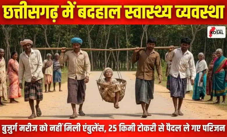 छत्तीसगढ़ में फिर सामने आई बदहाली की तस्वीर: बुजुर्ग मरीज को नहीं मिली एंबुलेंस, 25 किमी तक टोकरी में ढोकर ले गए परिजन