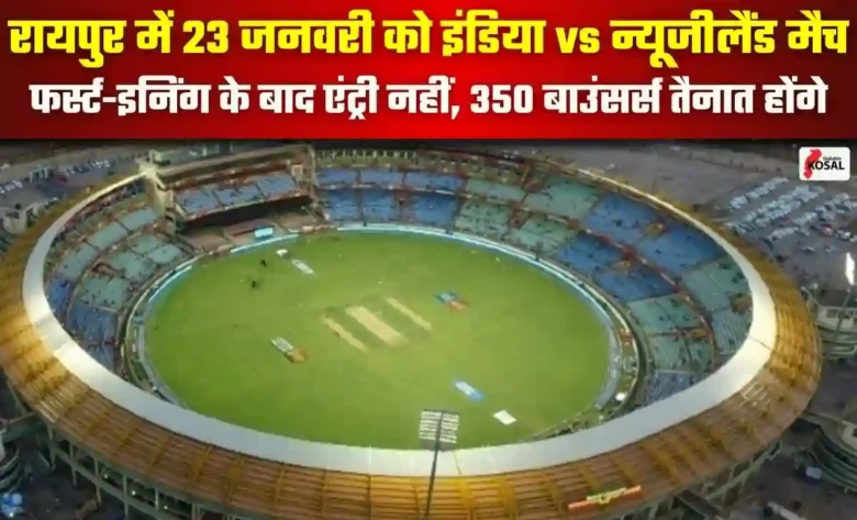 रायपुर: नवा रायपुर स्थित शहीद वीर नारायण सिंह अंतरराष्ट्रीय क्रिकेट स्टेडियम में 23 जनवरी को होने वाले भारत बनाम न्यूजीलैंड टी-20 मैच के लिए तैयारियां अपने चरम पर हैं। छत्तीसगढ़ क्रिकेट संघ (CSCS) ने इस बार सुरक्षा और अनुशासन को लेकर बेहद कड़े फैसले लिए हैं। संघ ने स्पष्ट कर दिया है कि पहली पारी समाप्त होने के बाद किसी भी दर्शक को प्रवेश नहीं दिया जाएगा। इसके अलावा मैदान की सुरक्षा के लिए विशेष इंतजाम किए गए हैं ताकि खिलाड़ी सुरक्षित रहें और मैच बिना किसी रुकावट के पूरा हो सके।