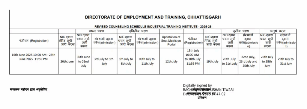 CG ITI First List Date 2025: छत्तीसगढ़ में आईटीआई (ITI) प्रवेश सत्र 2025-26 के लिए प्रथम चरण की चयन सूची (Merit List) अब 01 से 02 जुलाई 2025 के बीच जारी की जाएगी। पहले यह लिस्ट 27 जून को जारी होनी थी, लेकिन विभागीय कारणों से इसे स्थगित कर दिया गया। विभागीय सूचना अनुसार, अब नए कार्यक्रम के तहत मेरिट लिस्ट और कॉलेज में प्रवेश की तिथियों को पुनर्निर्धारित किया गया है।
